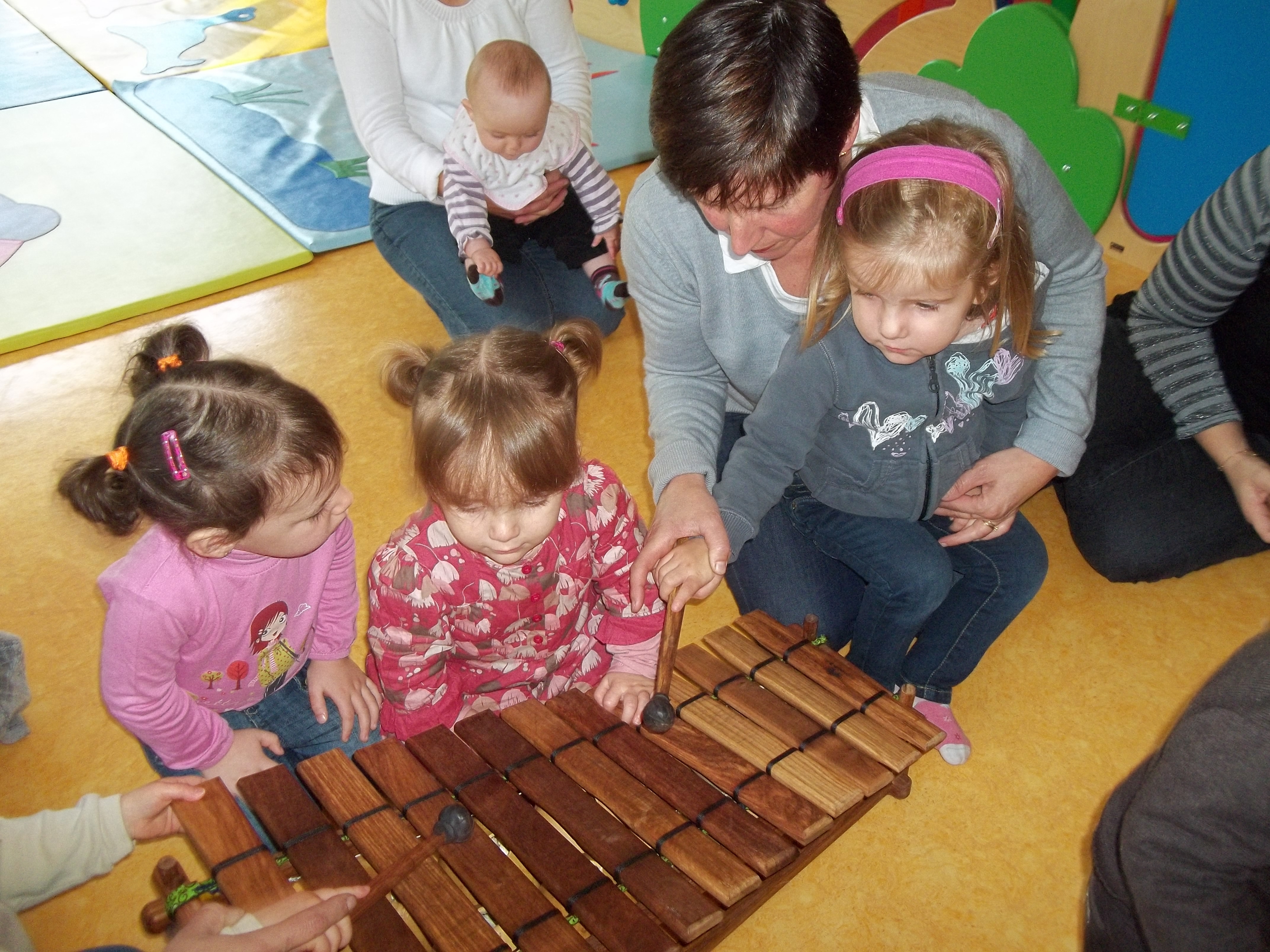 Sophie travaille par ailleurs dans le secteur petite enfance à la crèche familiale de Dieppe : « les enfants avec leurs assistantes maternelles participent à une séance de musique qui se déroule ainsi : pour commencer des comptines de doigts, suivies de manipulation de petites percussions. Puis ils écoutent un conte musical que j’accompagne d’instruments variés (flûte traversière, à bec, métallophone, guitare, balafon, tambour de la mer, cloches…). Une berceuse clôture la séance… »
